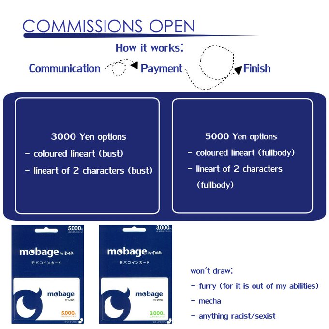 As I don't have paypal I thought a bit about what to offer. If you don't know how to obtain mobacoins, feel free to ask. There are also more possibilities than 3000¥/5000¥, however these are the much preferred ones. DMs are open! 🐰