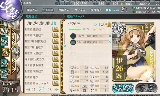 今月中旬に入る頃には改装条件満たしてたのに、全然被弾(中破)しなかったため、図鑑が埋められずここまで延びてしまいました…。
