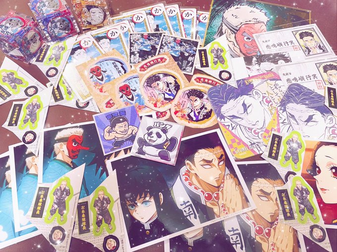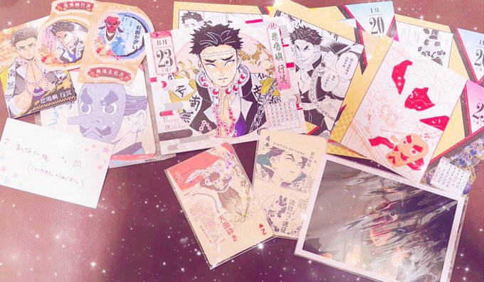 素敵便〜📿👺!!!!お譲りとプレゼントたくさんいつもありがとう😭得体の知れないブロマイド😭👍(意図的ではなく冨岡さんが綺麗に隠れすぎてごめんなさい💦)名刺やカルタもありがとう😭❣️ そしてお友達にも優しくしていただいて大好きな原画シールやひめくりカレンダーまで😭ありがとうございます😭
