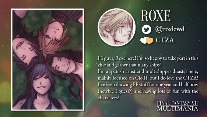 Next we have the awesome @Roxlewd!💚 Roxe will be drawing Cloud/Tifa/Zack/Aerith and is a multishipper disaster 😉