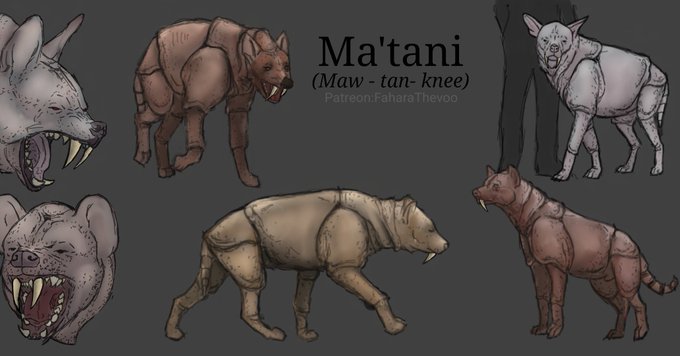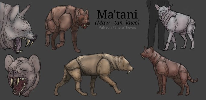 Welcome back to #thetravelernovel Universe. The Ma'tani are mammals known to inhabit the desert plains of Arrowsgate. Thick hide shields them from sandstorms creating perfect cover for hunting. Each has two 4in long fangs used to hold their prey and snap the neck. #ao3