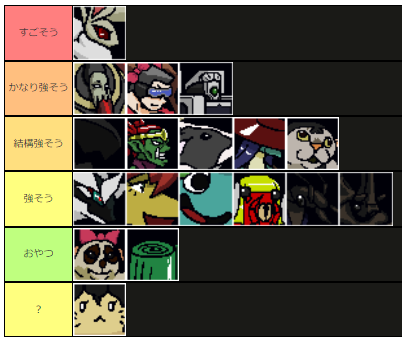もんめすー部製品版ver.0.72、1週間ほど触ってみてのなんとなくTier表。ちびキャラはうまく扱えないので想像。超極端な組み合わせ多そうなので強さよりも"相性"大事そう。