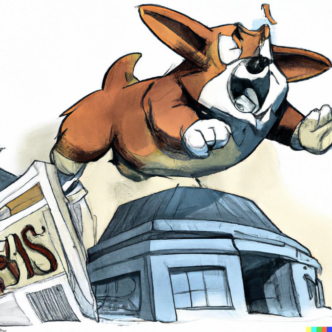"A giant cartoon corgi smashing the Discovery Headquarters. Newspaper picture."