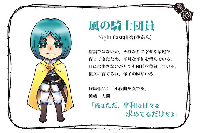 【キャラ紹介】風の騎士団の中でも年若い青年です。西の国の中でも閑静な田舎の出身であり、穏やかで平和な日々を望んでいます。育ててくれた祖父との約束のため、騎士となり、大切な妹を守ろうとしています。戦いのことしか考えない者は苦手で、理解が難しいと考えているようです。