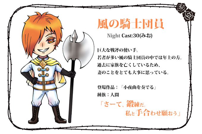 【キャラ紹介】風の騎士団の中でも大柄で、派手に戦斧を振り回すことのできる剛腕の持ち主です。普段は間延びした口調で話すことが多く、敬語には気を付けていますが、時々ボロが出てしまうようです。団員すべてを友人であり家族でもあると考え、とても大切にしています。