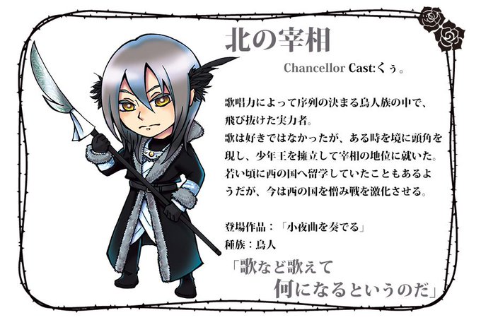 【キャラ紹介】鳥人族出身ですが近しい家族はおらず、成鳥になる頃からめきめきと頭角を現し、実力だけで宰相に成り上がりました。政治手腕はなかなかのもので、北の国の豊富な資源を利用して軍備の強化も怠りません。いつも冷静ですが、西の国に対しては何か強く執着する理由があるようです。