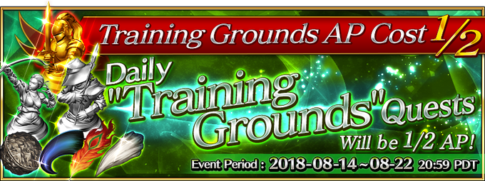 For a limited time, Novice, Intermediate, Advanced, and Expert "Training Grounds" Quests (available within Chaldea Gate) will have 1/2 AP cost!
