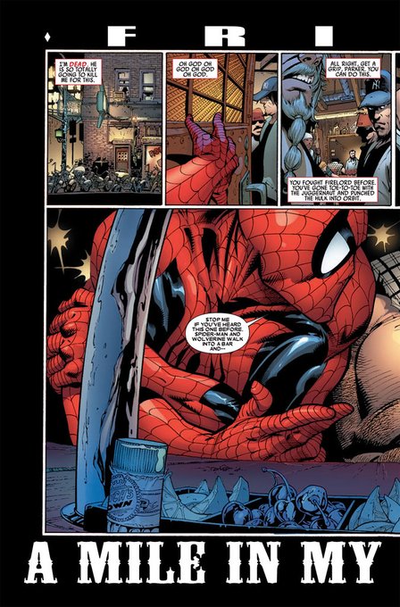 Je me souviens de cette épisode le Wolverine 74 de @jasonaaron et @AdamKubert je crois on suivait Wolverine dans son Quotidien et c'était chaque fois des moments de vie de souffrance de combat de guérison de Beuverie parfois d'amours 😃