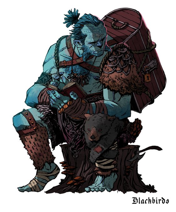 Jotunnkin scholar from @blackbirdsrpg - he's flicking through his sketchbook to try and identify a bird like the one perched next to him that has human eyes and speaks with the voice of an angel. He eventually finds it (entry 22, page 22) 6/6