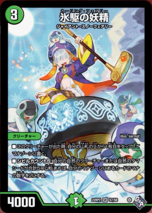 3コストで、横に自然のクリーチャー4体居れば、実質的なマナが2倍+タップして1マナ加速のジャイアント・スノーフェアリー……