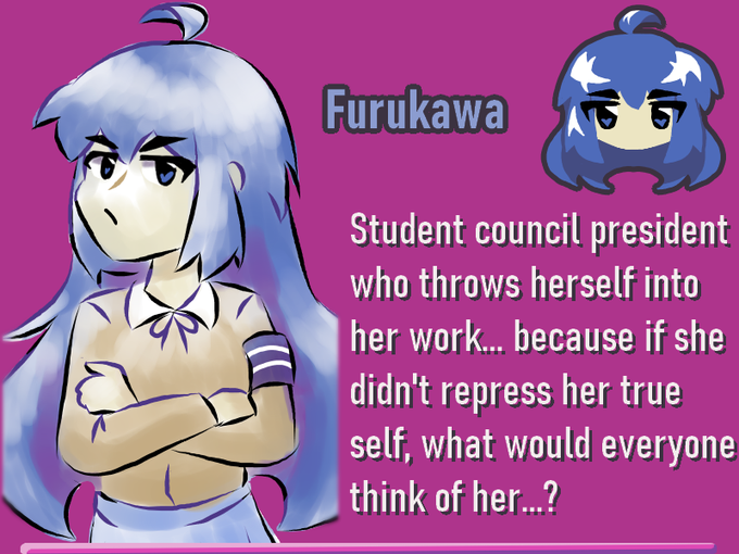 Made profiles for the main four characters of the visual novel, to fill out the Itch page a little. Witness my mediocre people-drawing abilities