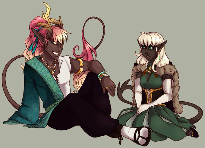 Furtail & Murmur! A Fey tiefling and a hornless tiefling, both glamorous bards and striking personalities.