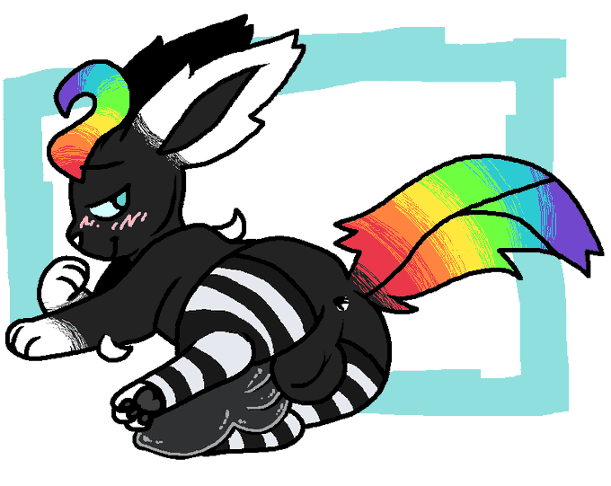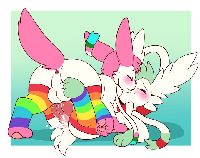 @kithorie Hey thanks for the chance! Maybe having my Sylveon laying on their side, showing off their paws and having a ribbon pointing at their cock?