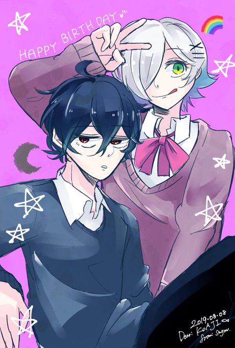 @HeyKeiHello こあじ~!!!!!誕生日おめでとう🎉🎉🎉リクエスト頂いた夜野くんとオマケの虹鱒くんです🌙🌈💕こあじの人柄も絵柄もセンスも大好きだ~!また今度遊びに行きましょ😘❤️素敵な一年になりますように🥳