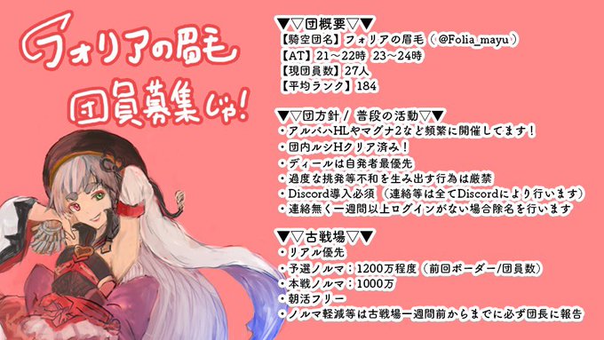 騎空団「フォリアの眉毛」は現在25人で活動中です! 予選で全力を出し本戦はフリーランの団です。 闇古戦場は全力を出し過ぎて間違えてシードを取ってしまいました、個性的な団員が多いのでみんなでワイワイしたい方は是非! #団員募集 #団活 #グラブル
