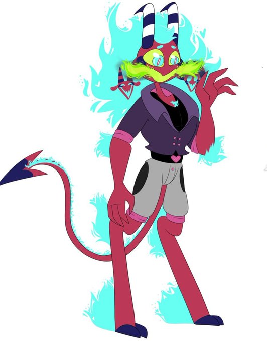 This is my Oc Belzoni, baby or adult, with either of his dads (Fizzarolli or Asmodeus)💞