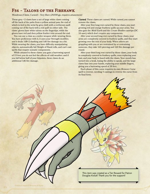 #DnD #Pokemon #MagicItem #OfTheDay, with a #fusion of #Blaziken and #Sandslash as a set of #claws that will let you #burrow and do some #fire damage, but are also cursed to turn you into a ferocious #beast! Get the full #PDF and help support us today https://t.co/3MmNt5IxsV