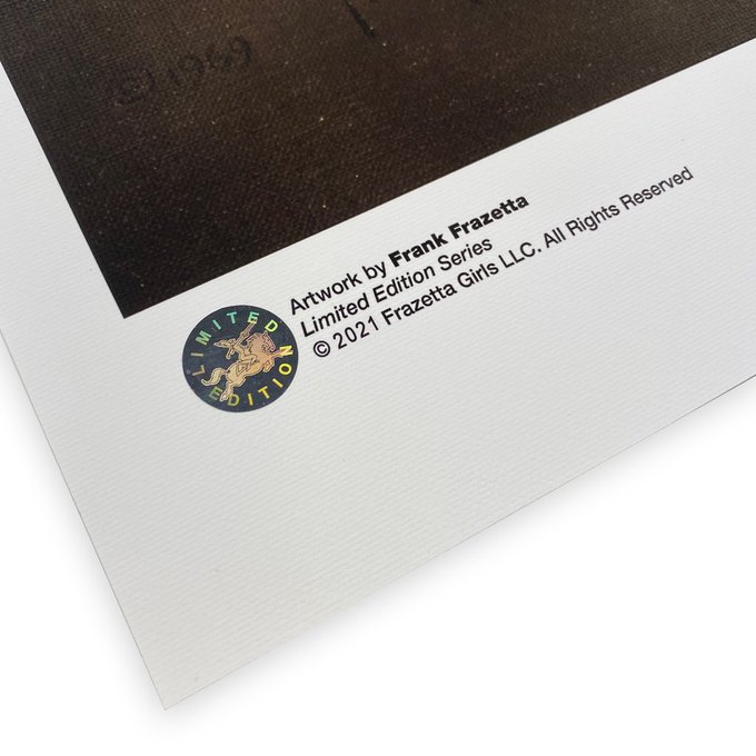This artwork is the revised version of “Mongol Tyrant.” Frazetta’s wife, Ellie found the first version “too demonic” to hang on the walls of their home. To please Ellie and not scare his children, he repainted the figure to be a bit less sinister.