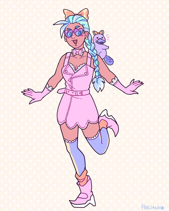 Pastel green, blue, orange & pink colors, a platypus mascot, 1 long braid hairstyle, leather biker dress, cool sunglasses, and the theme was Kaiju so her power is to turn into a giant lady 😂
