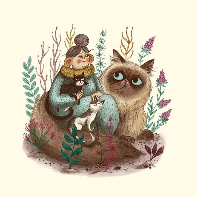 A happy lady with her cats. I wish I had a giant cat to snuggle up with today, the studio is absolutely freezing! Where did the sun go? ☀ .