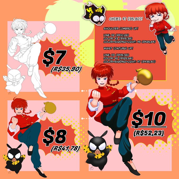 @YagiDesenhos Em ordem: Minha versão do "Desenhe isso no seu estilo" da @Mayoshoo_ que desenha coisas adoráveis, fanart para @Hellish_Sock que faz furry fofo, fanart para @Megoko4 que faz uns pornozão e minha tabela de preços cheia de frufru, tudo negociável.