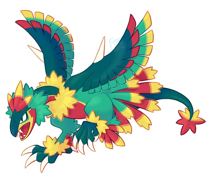 Poke'hybrid OC commissions! These two are domestic and wild variations of each other respectively. They're both mainly archeops with features from ho-oh, galazrian zapdos, and other requested customizations.