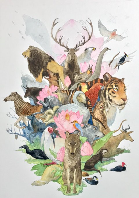 絶滅した哺乳類、鳥類、爬虫類のイラストですが、お花は蓮と曼珠沙華を混ぜたモノで、実在しません。