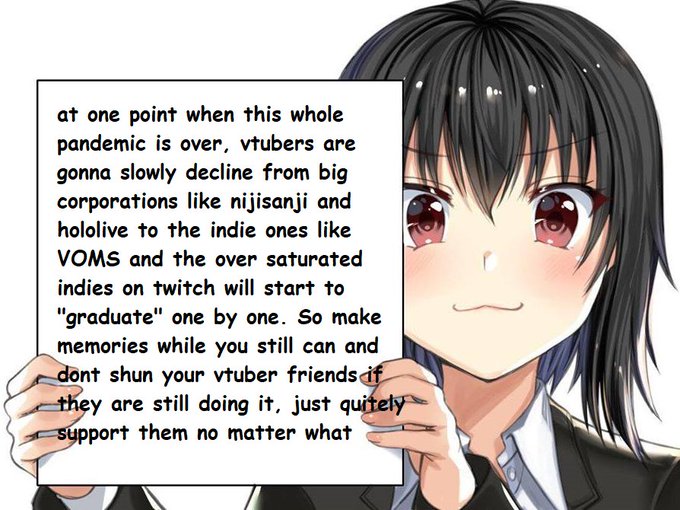 obviously not everyone will graduate the moment the pandemic vanishes but you will see how its gonna affect every vtuber out there, no one new about hololive before the pandemic same goes with nijisanji, same thing for every vtuber before them.