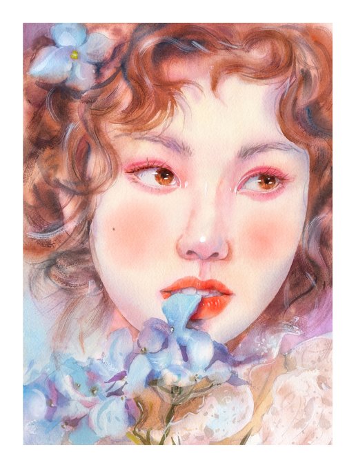水彩-戴蓝花的赪颜少女 #水彩 #人物 #绘画 #Watercolor #Scenery #painting #水彩画 #水彩イラスト #水彩フレーム