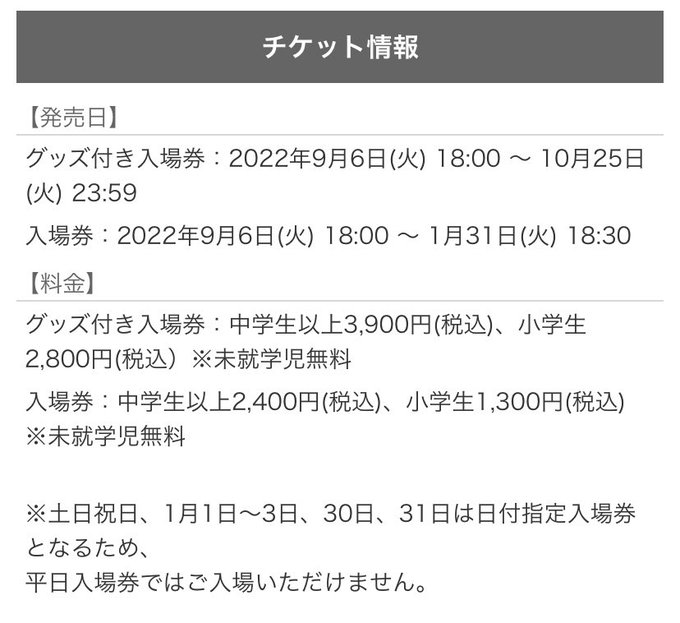 입장권(굿즈포함): 중학생 이상 3900엔 / 초등학생 2800엔