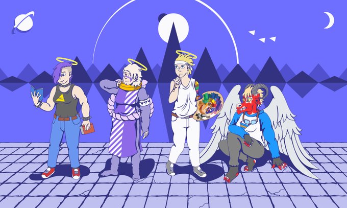 The cast of Agla's Art (L-R: Harahel, Agla, Uriel, Verin) in a more detailed scene than the usual completely abstract backgrounds.