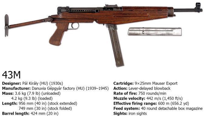 The Hungarian submachine gun 43M might be classified as a carbine at first glance due to its large size and long barrel length compared to other SMGs. However, its powerful caliber was originally made for the pistol Mauser C96, ultimately classifying the 43M as an SMG.