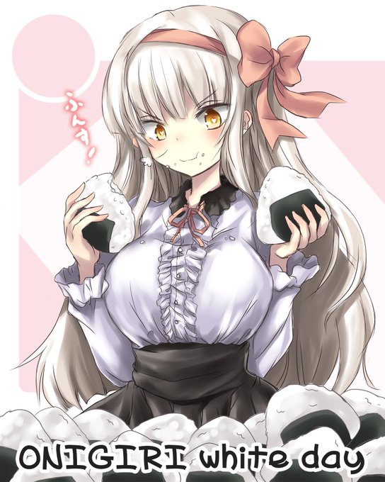 ホワイトデーのお返しに大量のおにぎり貰って夢中になりながらふんすしているおにぎりさん🍙