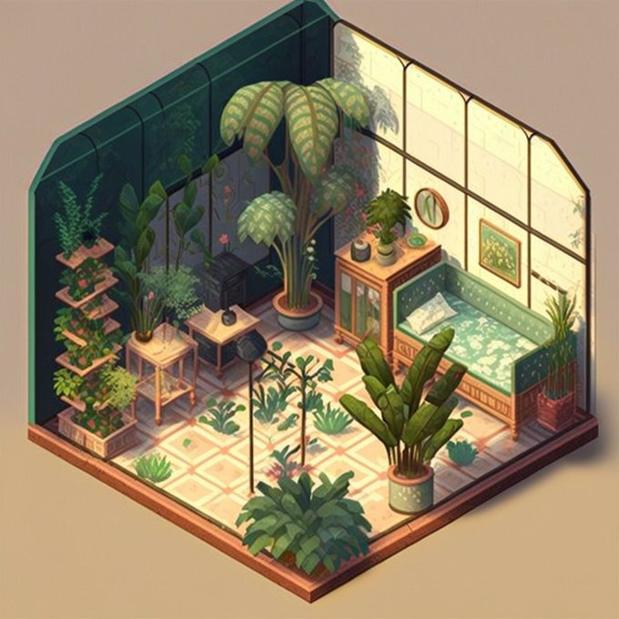 「isometric 部屋名」だと色んな部屋の等角図が作れる。これは植物いっぱいの部屋のバリエーション。