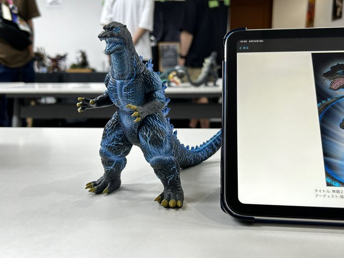 #怪G大合戦 仮病・改さん@Goji_Kebyo がリペイントされたゴジラ(所有者は㌧吉さん @Godziton71340 )と、私が描いたゴジラでツーショットを撮らせていただきました。 仮病・改さんによると、私が描いたブルー・バーニングゴジラがこのリペイントの着想元の1つになったそうです。