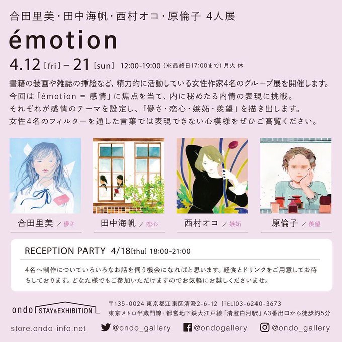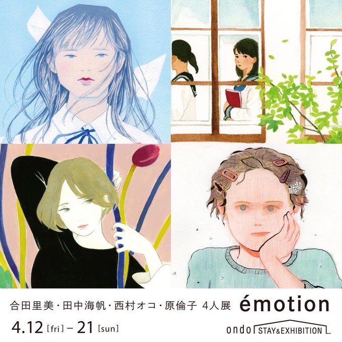 @ondo_gallery (東京・清澄白河)で開催。合田里美・田中海帆・西村オコ・原倫子 4人展「émotion」
