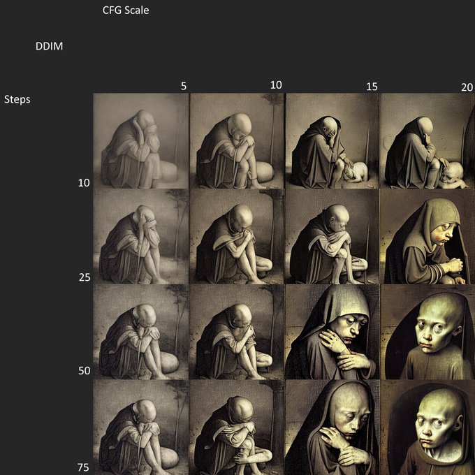 #StableDiffusion Following in @proximasan's steps (pun?), I've put together a comparison of steps vs CFG scale. So far, using two sampling methods, may try some more, but the results were not as interesting as I expected. This first set was the k_lms method.