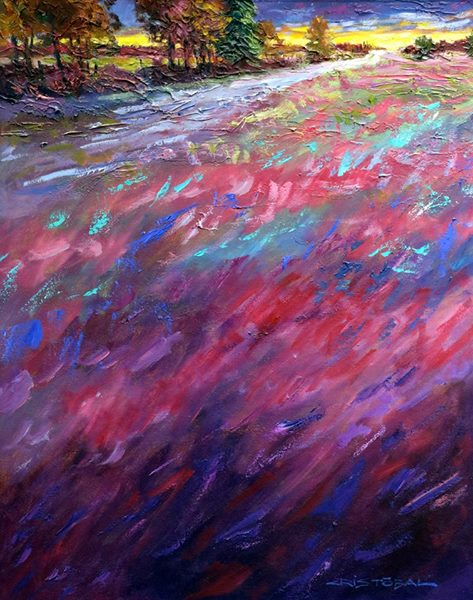 Our pick for #paintingoftheday by Cristobal, who contrasts red ochre against the pastel tones of the landscape. Corde de bois au lever du jour. Acrylic on Canvas . 24x36".