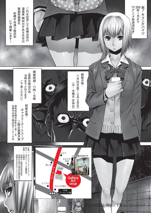 #艶惨 にて開催された #キリングバイツ @killingbites 「ぷち複製原画展」に続きまして11月24日よりアートスープでもキリングバイツのアニメ化を祝い、隅田かずあさ先生 @s_kazasa の原画展を開催します!