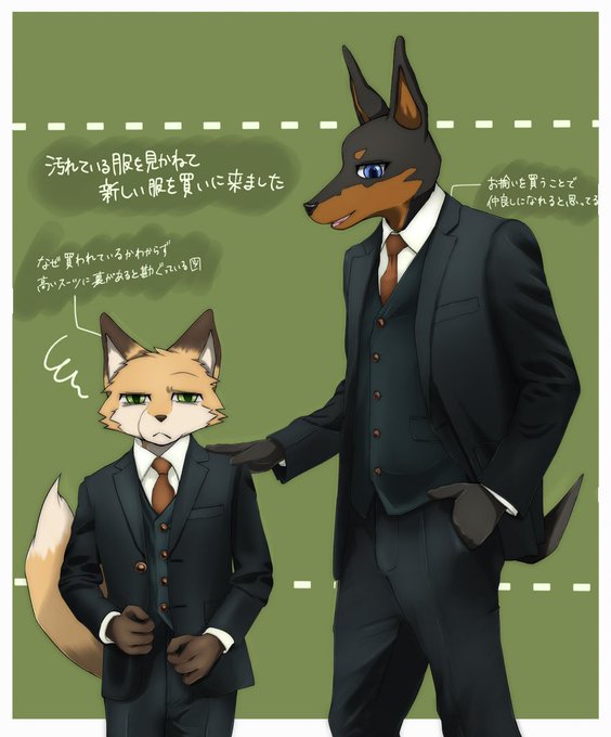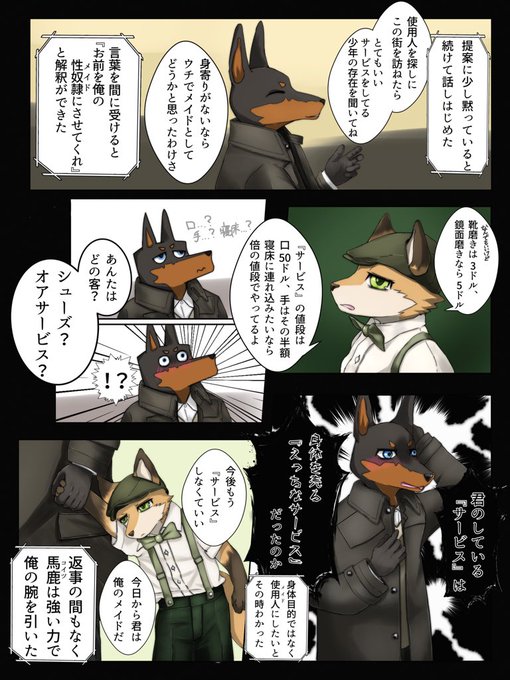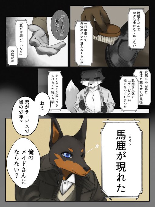 前アカウントに載せていた、靴磨きで生計を立てるキツネの少年が突如現れたドーベルマンな紳士にメイドにならないかと提案される漫画(ハッピーエンド確約)らしきものです👞 #シューズ・オア・サービス