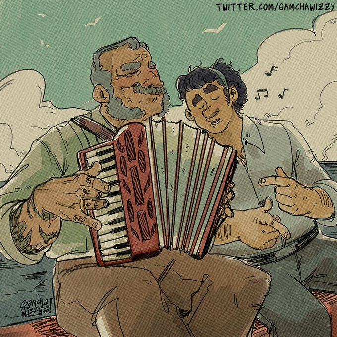 "And he would sit at the boat's edge after the day's catch, singing loudly with his grandfather, their voices carried off by the wind into the sea..."