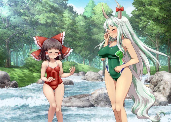 「ほら、もっと足を動かさないと水の中で泳ぎが安定しないぞ」「(せ‥背中に凄く大きくて、柔らかい物が当たってる感じがする‥‥)」妖怪退治のついでに泳ぎを霊夢に教える慧音さん、霊夢がドキドキしっぱなしなのが手に取るように分かる気がしますw
