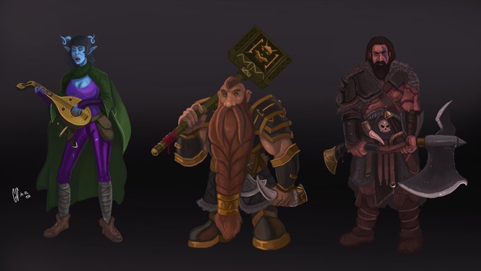 Ya tengo dos diseños de personajes hechos para la nueva hoja de personajes de mi porfolio, para el tercer personaje tal vez haga a una tiefling, a ver como acaba saliendo la cosa
