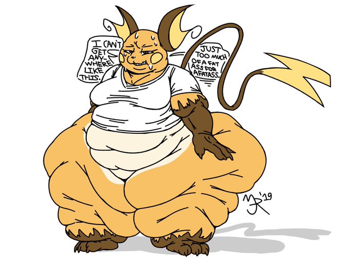 Here is my Raichu OC. Her name is Clara and her concept is that she is a fatty/extremely bottom-heavy Raichu, who gets into silly situations, either caused by or involving her big fat ass. Drawn by @mrjkingly