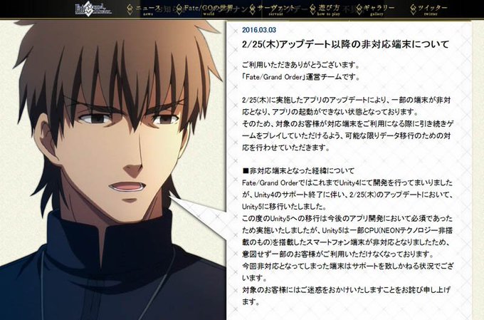 FGOがアプデのせいで非対応になっちゃった機種を切り捨てた件…告知ページの横に綺礼が喋っている様なコラをするだけで炎上は収束すると思うんですよー(そうか?)