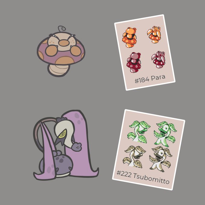 i redesigned discarded designs from the pokemon gold/silver beta, the paras pre-evolution pretends to be a mushroom and its pure insect, meanwhile the weepinbell evolution is the sprout of the dead plant and its pure poison.