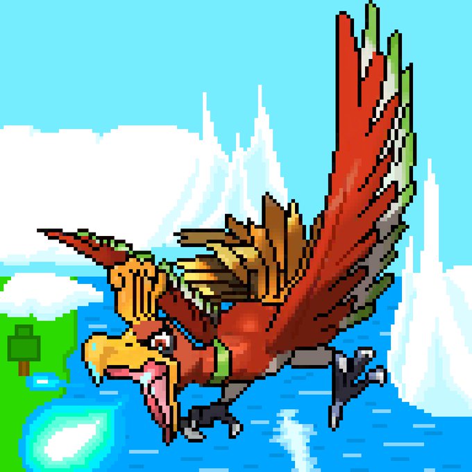 ホウオウの炎の形を作り直して、背景付きも作りました。海と陸地。 ジョウト地方のつもり #ドット絵 #ポケモン #ポケットモンスター