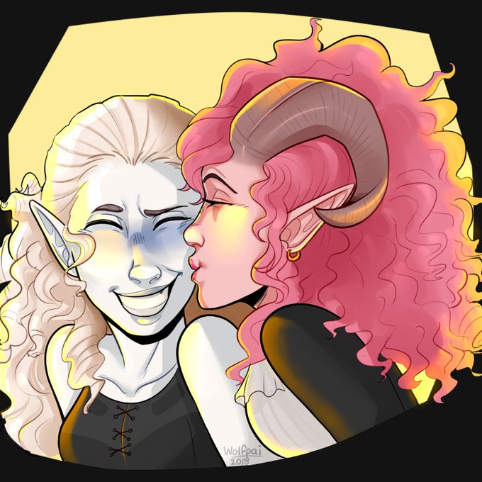 Forgot to share this! My tiefling mastermind rogue Bernadette and her girlfriend Tippi, the half elf warlock, who belongs to @rinachur !
