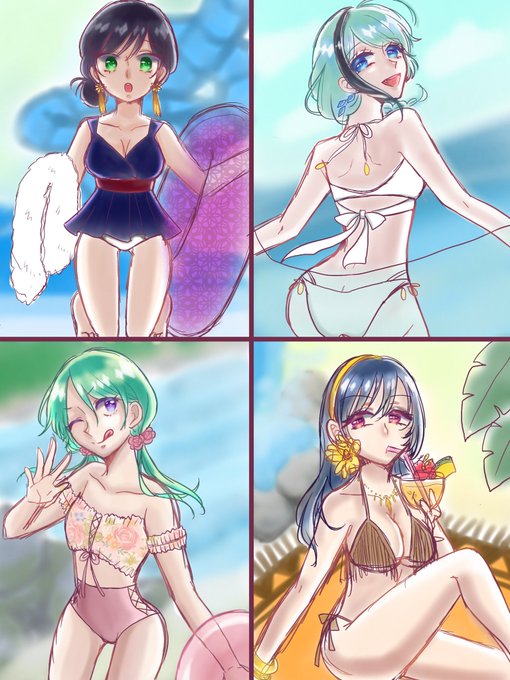 水着イラストです!ペン入れしたら、ラフからイメージが遠ざかったので、あえてラフのままにしました✨杏奈ちゃんはプール、私は海、杏珠ちゃんは川、みやこ姉さんはリゾート!背景はぼけて見えるように水彩だよ🦈🦐