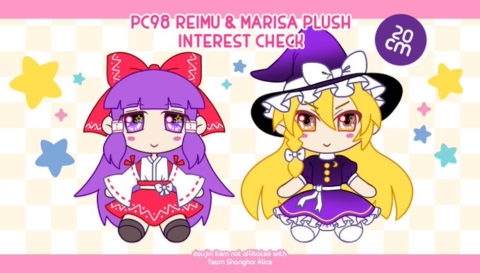 I am doing an interest check for doujin PC98 Reimu & Marisa plushies. If you are interested, please fill in the form. If there is enough interest, I can order prototypes and open pre-orders!